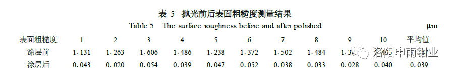 机械结合是二硫化钼涂层的主要形成方式。当二硫化钼分子与基体接触时,由于基体表面比较粗糙。二硫化钼分子就会沉积在由于表面粗糙而形成的表面微凸体上,从而形成机械结合。机械结合的强度主要取决于表面的粗糙程度。为了验证上述结论,本文作者采用不同预处理方法的低碳钢基底材料进行了涂层实验。首先,对低碳钢进行砂纸打磨,去掉表面氧化层,再用抛光机进行抛光处理,然后采用上述3种涂层方法在试样表面涂覆二硫化钼涂层,并测出涂覆前后试样的表面粗糙度,结果见表5。
