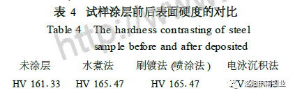 表4为试样涂层前后表面硬度的对比。从表4可知,采用水煮法和刷镀法(喷涂法)进行表面处理后,试样表面形貌发生了变化,但表面硬度几乎没有变化,未涂层的表面硬度为HV 161.33,水煮法和刷镀法(喷涂法)涂层后表面硬度均为HV 165.47,即由于膜层比较薄,对试样的表面硬度未产生影响。而经过电泳沉积二硫化钼后,涂层后表面硬度增大为HV 229.43,即经过电泳沉积二硫化钼涂层后增大了基体的硬度,从而提高了基体的耐磨性。